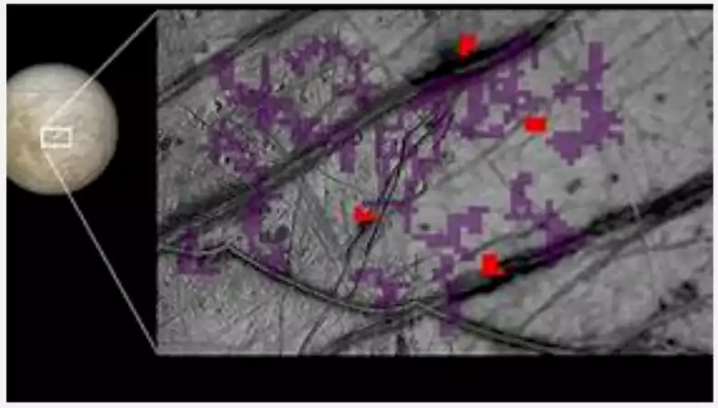 Europa’s surface is covered in a network of deep cracks and ridges, and these ammonia signals have been found associated with these cracks. Scientists believe thatOf